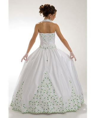 me gusta mucho el qe sea blanco, en el sentido de que el vestido del cumpleaños de 15 de antes era blanco, y como ya los cumpleaños de 15 no se toman como eso, sino qe se toman como una noche en el boliche, que por lo menos tenga algo de lo qe realemente es el cumpleaños de 15 me gusta, los detalles en verdes, esta bueno el color, pero le haria otra cosa, ni ese bordado, pero en si mas o menos me gusto el vestido